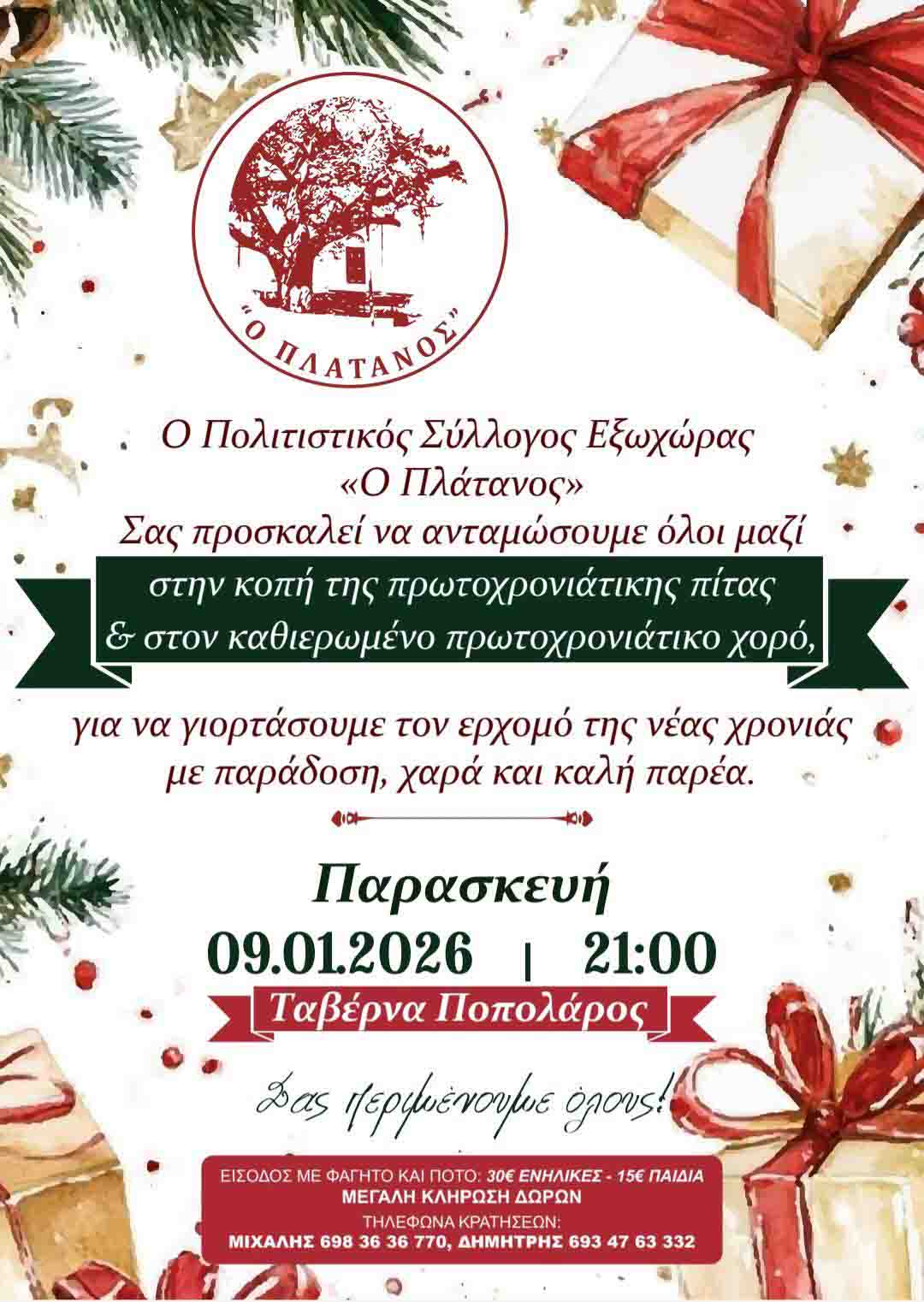 Σε γιορτινό κλίμα και με στόχο να δοθεί ραντεβού όλων σε μια κοινή βραδιά, ο Πολιτιστικός Σύλλογος Εξωχώρας «Ο Πλάτανος» απευθύνει ανοιχτή πρόσκληση για την κοπή της πρωτοχρονιάτικης πίτας και τον καθιερωμένο πρωτοχρονιάτικο χορό.