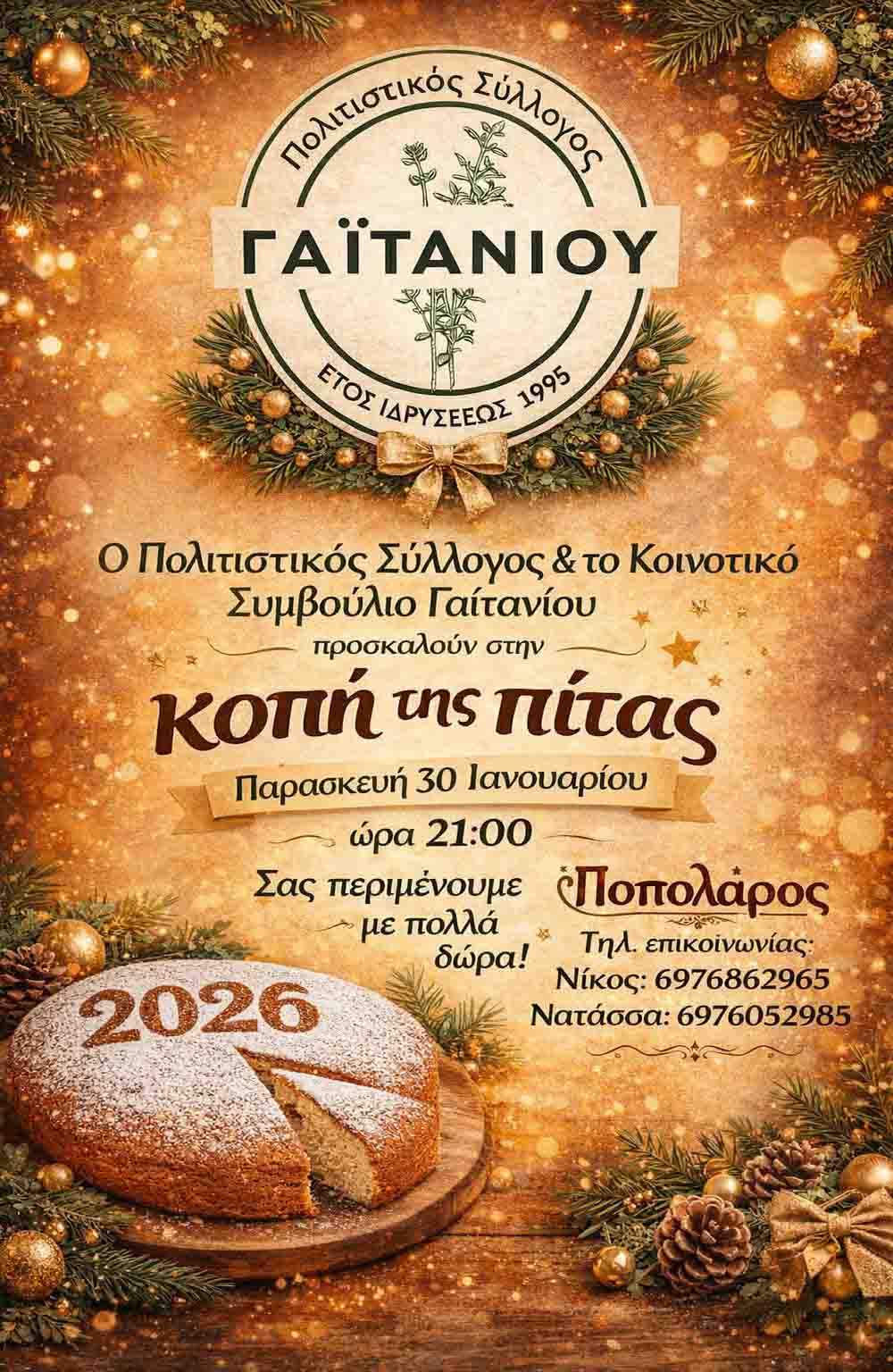 Κεντρική στιγμή αυτής της εκκίνησης για τη νέα χρονιά αποτελεί η εκδήλωση για την κοπή της πίτας, στην οποία ο Πολιτιστικός Σύλλογος και το Κοινοτικό Συμβούλιο απευθύνουν ανοιχτή πρόσκληση προς όλους. Η κοπή της πίτας έχει προγραμματιστεί για την Παρασκευή 30 Ιανουαρίου, με ώρα έναρξης 21:00, στον «Ποπολάρο», ενώ γίνεται αναφορά ότι οι παρευρισκόμενοι θα έχουν την ευκαιρία να συμμετάσχουν σε μια βραδιά με πολλά δώρα.