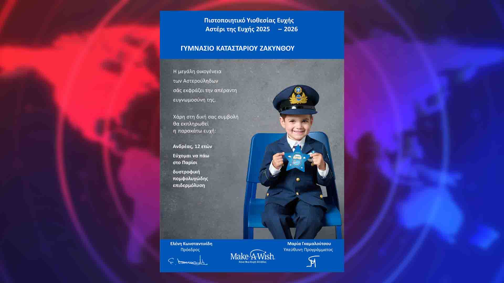 Με επίσημη επιστολή αναγνώρισης, η Αστική μη κερδοσκοπική Εταιρεία «Αστέρι της Ευχής – Make-A-Wish» απευθύνει τις ευχαριστίες της προς το Γυμνάσιο Κατασταρίου Ζακύνθου, επισημαίνοντας ότι η δωρεά του σχολείου συνέβαλε καθοριστικά στην πραγματοποίηση της ευχής ενός παιδιού που αντιμετωπίζει σοβαρή ασθένεια.