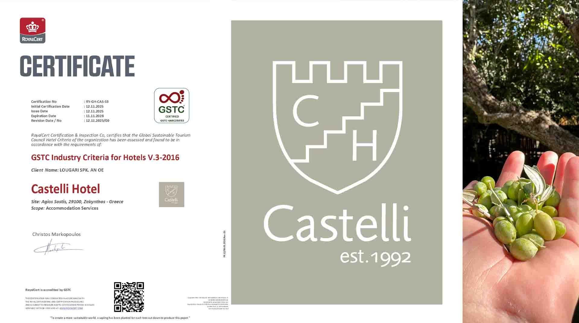 Με ιδιαίτερη χαρά ανακοινώνουμε ότι το Castelli Hotel, στον Άγιο Σώστη Ζακύνθου έλαβε επίσημα την Πιστοποίηση GSTC (Global Sustainable Tourism Council), μέσω του διεθνώς αναγνωρισμένου φορέα Royal Cert.