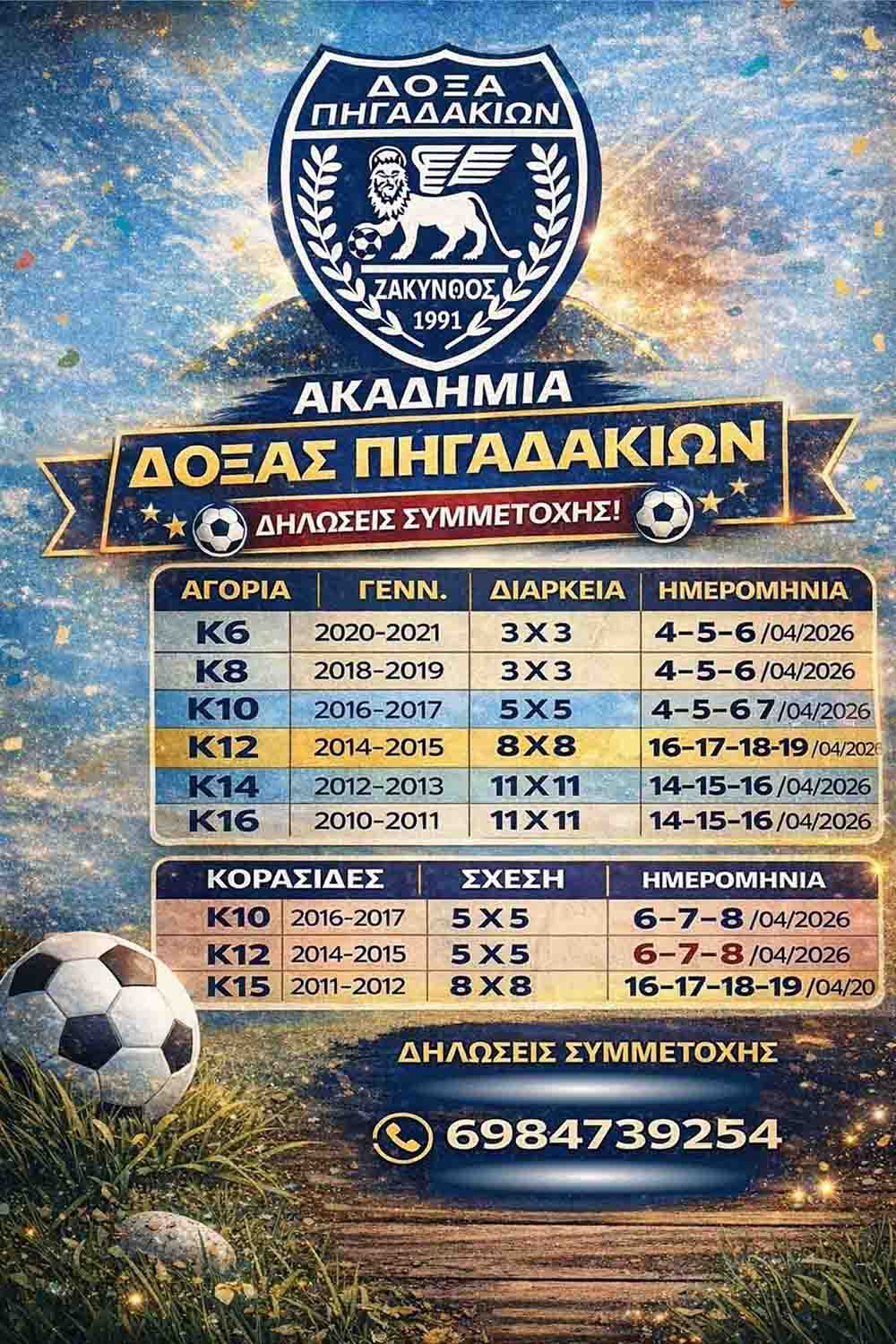 Οι δηλώσεις συμμετοχής για τις ακαδημίες γίνονται τηλεφωνικά στο 6984739254, με τους διοργανωτές να απευθύνουν ανοιχτή πρόσκληση σε ομάδες και αθλητές να λάβουν μέρος σε ένα Πάσχα γεμάτο ποδόσφαιρο, παιχνίδι και ενθουσιασμό.