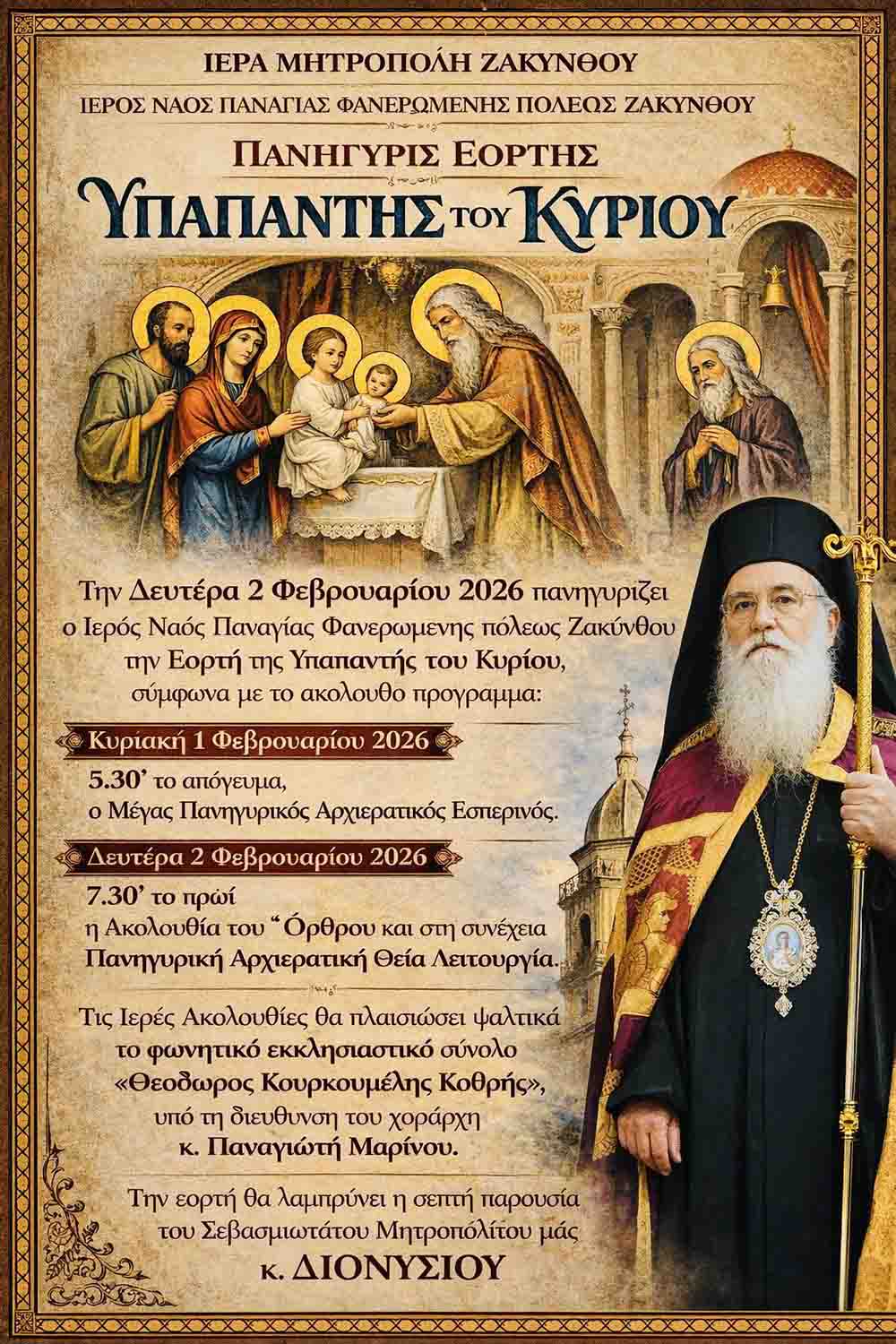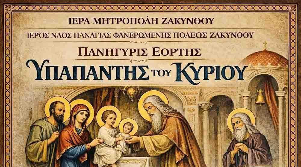 Με ιδιαίτερη λαμπρότητα θα τιμηθεί και φέτος στην πόλη της Ζακύνθου η μεγάλη δεσποτική εορτή της Υπαπαντής του Κυρίου, στον Ιερό Ναό Παναγίας Φανερωμένης, ο οποίος πανηγυρίζει τη Δευτέρα 2 Φεβρουαρίου 2026.