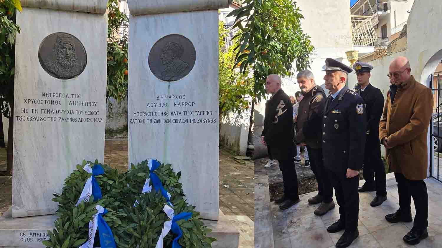 Εκεί τελέστηκε κατάθεση στεφάνων στα μνημεία του Μητροπολίτη Χρυσοστόμου και του Δημάρχου Λουκά Καρρέρ, των δύο εμβληματικών μορφών που, με τη στήριξη ολόκληρης της ζακυνθινής κοινωνίας, συνέβαλαν καθοριστικά στη διάσωση όλων των εβραϊκών οικογενειών του νησιού από τη ναζιστική θηριωδία κατά τη διάρκεια της Κατοχής.