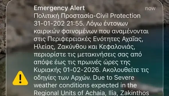 Σε αυξημένη επιφυλακή βρίσκονται από το βράδυ του Σαββάτου οι Αρχές, καθώς ενεργοποιήθηκε το σύστημα προειδοποίησης 112 για έντονα καιρικά φαινόμενα σε Αχαΐα, Ηλεία, Ζάκυνθο και Κεφαλονιά. Το προειδοποιητικό μήνυμα καλεί τους πολίτες να περιορίσουν τις μετακινήσεις τους από τις βραδινές ώρες έως το πρωί της Κυριακής και να συμμορφώνονται με τις οδηγίες της Πολιτείας, λόγω των δυσμενών συνθηκών που αναμένονται.