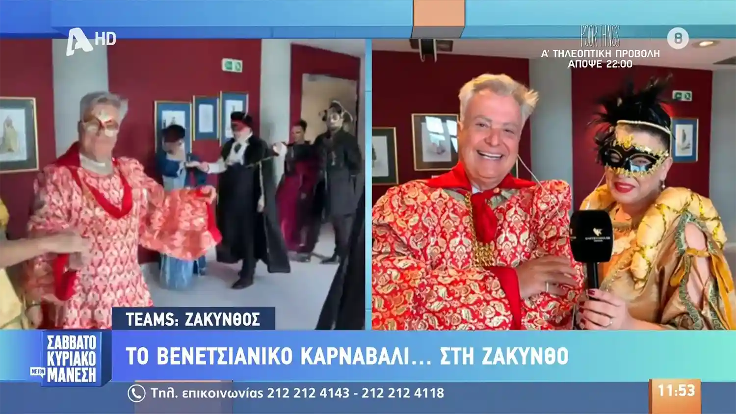 Σε πανελλαδική τηλεοπτική μετάδοση βρέθηκε σήμερα το Λύκειο Ελληνίδων Ζακύνθου & η Giostra Di Zante, συμμετέχοντας ζωντανά στην εκπομπή Σαββατοκύριακο με τον Μάνεση του Alpha TV. Η σύνδεση πραγματοποιήθηκε από το φουαγιέ του Δημοτικού Θεάτρου Ζακύνθου, με επίκεντρο την παρουσίαση του Βενετσιάνικου Καρναβαλιού της Ζακύνθου.