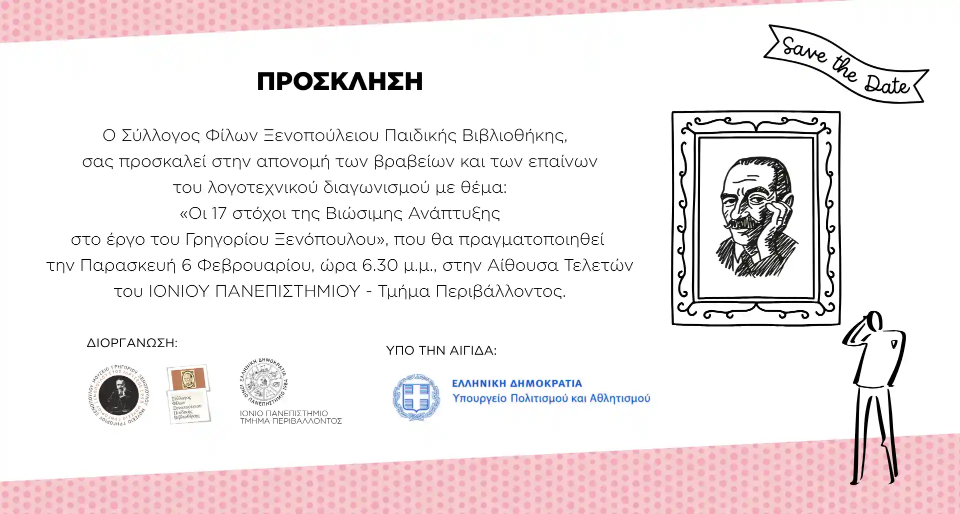 Εκδήλωση αφιερωμένη στη δημιουργικότητα και τη σύγχρονη σκέψη διοργανώνει ο Σύλλογος Φίλων Ξενοπούλειου Παιδικής Βιβλιοθήκης, με αφορμή την ολοκλήρωση λογοτεχνικού διαγωνισμού που είχε ως κεντρικό άξονα τους 17 Στόχους της Βιώσιμης Ανάπτυξης, όπως αυτοί αποτυπώνονται στο έργο του Γρηγορίου Ξενόπουλου.