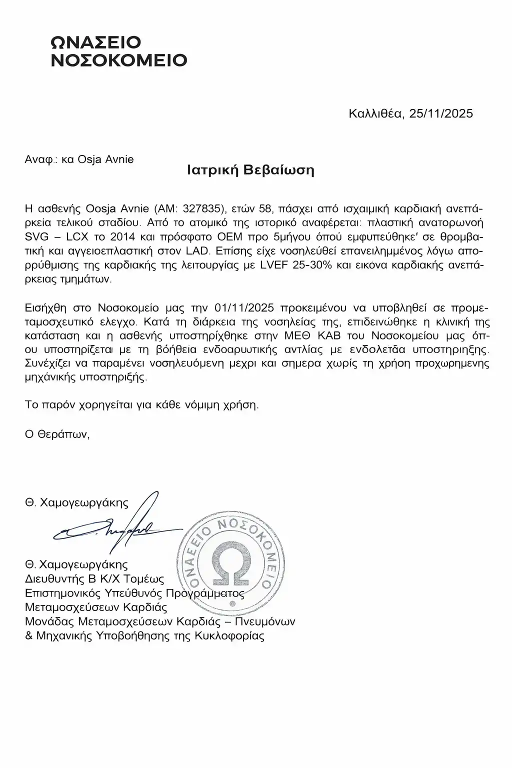 Σύμφωνα με όσα γνωστοποιεί, μητέρα δύο δίδυμων κοριτσιών νοσηλεύεται στη Μονάδα Εντατικής Θεραπείας του Ωνάσειο, αντιμετωπίζοντας καρδιακή ανεπάρκεια τελικού σταδίου. Η οικογένεια έχει μετακινηθεί στην Αθήνα, όπου και παραμένει μέχρι να προχωρήσει η διαδικασία μεταμόσχευσης.